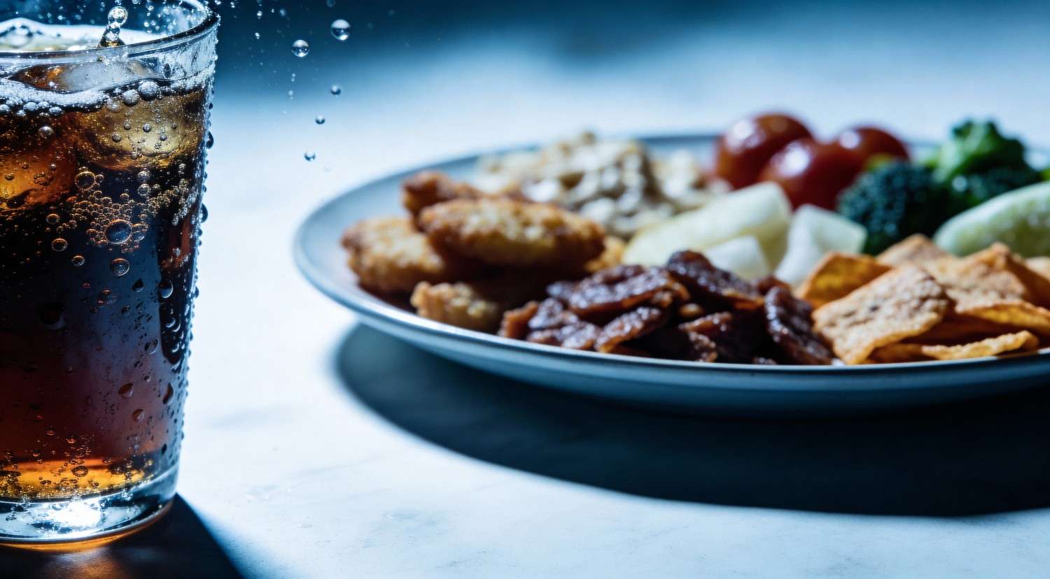 تفاعل السكر المضاف في المشروبات الغازية مع الكربوهيدرات المكررة في نفس الوجبة يعطّل عمل إنزيم AMPK المسؤول عن إدخال الجلوكوز إلى الخلايا. النتيجة؟ ارتفاع خطر الإصابة بالسكري من النوع الثاني بنسبة 2.8 مرة (دراسة Diabetologia 2023).