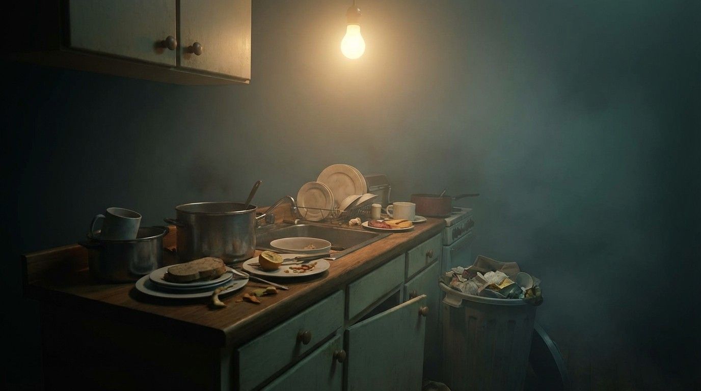 تخيّل معي… أنت تدخل المطبخ في حلمك، لكن بدل أن تكون رائحة الطعام الطازج تعبق في المكان، تجد الفوضى والأوساخ تملأ الأجواء. 😮